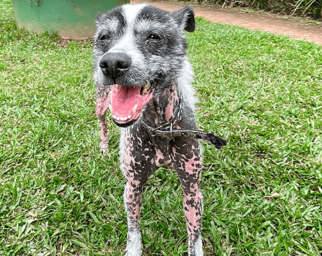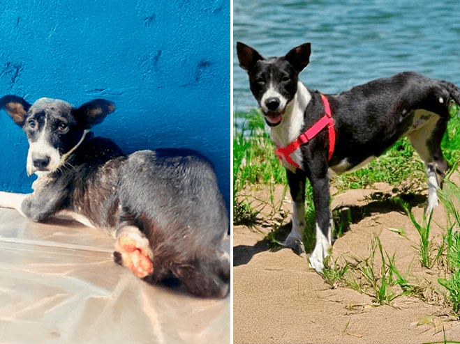 When she was rescued, she was weak, underweight, and her paw was badly injured. She could barely stand from the pain. With treatment, food, and care, she healed. Today, she runs freely, healthy and full of joy.